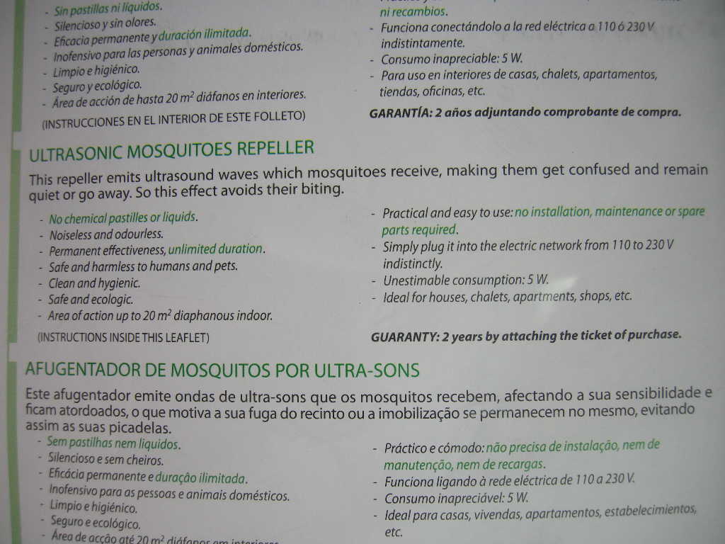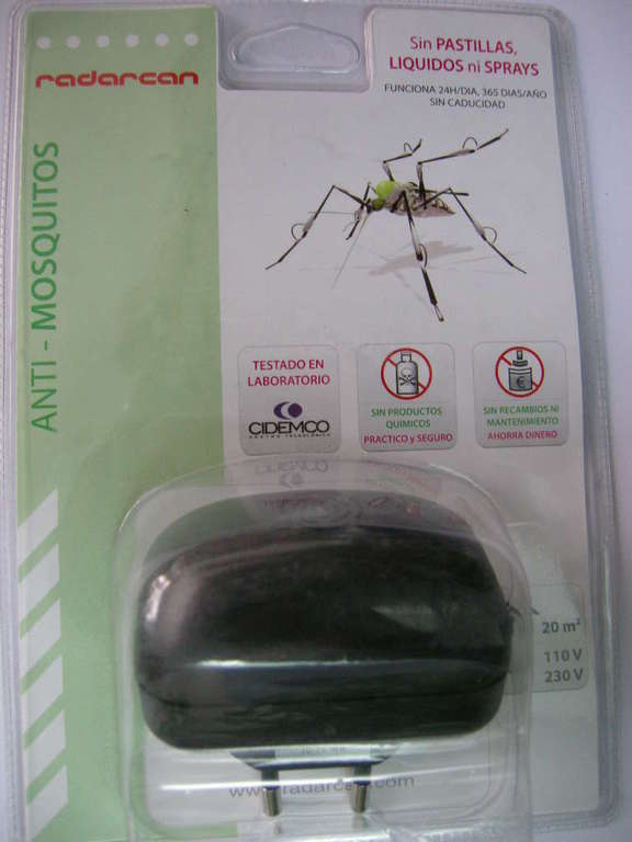 ΑΠΩΘΗΤΙΚΟ ΚΟΥΝΟΥΠΙΩΝ RADARCAN. Η συσκευή παράγει υπέρηχους οι οποίοι αποσυντονίζουν τα κουνούπια με αποτέλεσμα να αποτρέπετε το δάγκωμά τους. Τοποθετήστε τη συσκευή σε μια πρίζα μεσαίου ύψους και μην την καλύπτετε με τυχόν κουρτίνες ή έπιπλα. Η συσκευή πρέπει να είναι μονίμως τοποθετημένη στην πρίζα, 24 ώρες το 24ωρο αρκετά πριν ξεκινήσουν τα κουνούπια, σαν πρόληψη. Καταναλώνει μόνο 5 watt και καλύπτει χώρο 20 τετραγωνικών μέτρων. Πρέπει να τοποθετείται εντός του σπιτιού. Τη συσκευή παράγει η ισπανική Radarcan , η μοναδική ευρωπαϊκή εταιρία που παράγει ηλεκτρονικά απωθητικά εντόμων και τρωκτικών.