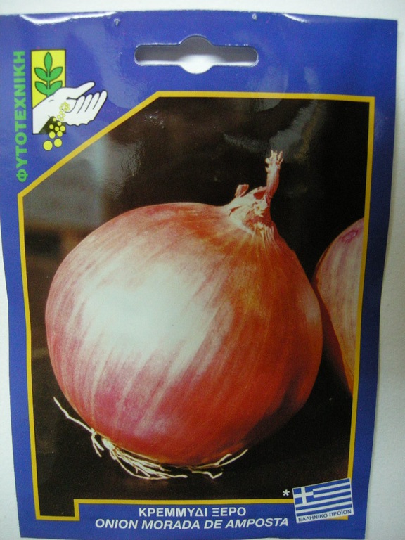 ΚΡΕΜΜΥΔΙ ΞΕΡΟ MORADA DE AMPOSTA. Βολβός με στρογγυλό σχήμα κεραμιδί χρώματος. Κατάλληλο για μακρόχρονη αποθήκευση. Ποικιλία μακράς ημέρας. Σπέρνεται Φεβρουάριο έως Απρίλιο και συγκομίζεται μετά από πέντε – πεντέμιση περίπου μήνες. Διατίθεται σε ερασιτεχνικό φάκελο των 4 g.