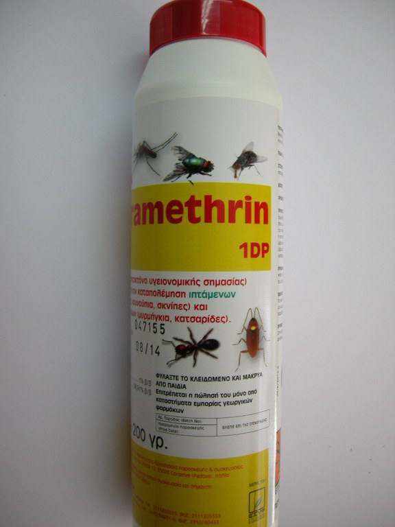 TETRAMETHRIN ZAPI. Παρασιτοκτόνο ( εντομοκτόνο ) υγειονομικής σημασίας σε σκόνη για την καταπολέμηση ιπτάμενων εντόμων ( μύγες, κουνούπια, σκνίπες ) και βαδιστικών εντόμων ( μυρμήγκια, κατσαρίδες ). Σκονίζουμε καθ’ όλη τη διάρκεια του έτους από μικρή απόσταση, με είκοσι γραμ./τετρ. μέτρο, ώστε να δημιουργήσουμε ένα λεπτό επιφανειακό στρώμα σκόνης ιδιαίτερα στις γωνίες ή τις χαραμάδες και όπου τα έντομα συνηθίζουν να περνούν ή να κρύβονται. Σκονίζουμε εσωτερικούς και εξωτερικούς μη κατοικημένους χώρους. Βάζο καθαρού βάρους διακοσίων γραμμαρίων.