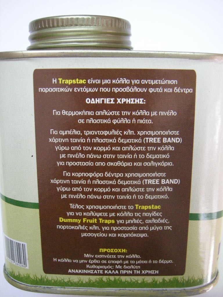 TRAPSTAC 500 γραμ, ΕΝΤΟΜΟΛΟΓΙΚΗ ΚΟΛΛΑ. Επαλείφεται με βούρτσα ή πινέλο, και δεν στεγνώνει. Μπορεί να χρησιμοποιηθεί σε θερμοκήπια, αγροκτήματα, κορμούς δένδρων, αμπέλια, καλωπιστικά φυτά κ.α. Μπορεί να χρησιμοποιηθεί πάνω σε κομμάτια πλαστικού, φύλλα πολυαιθυλενίου κλπ και ανάλογα με το χρώμα του πλαστικού έλκει και διαφορετικά έντομα, πχ το γαλάζιο έλκει θρίπες, το μπλε σκούρο και το μαύρο έλκει την τούτα και το κίτρινο έλκει αφίδες, βρωμούσες, μύγες κ.α. Η κόλλα είναι επιβλαβής εάν έρθει σε επαφή με τα μάτια ή το δέρμα και δεν πρέπει να την εισπνέουμε την ώρα της επάλειψης. Μεταλικό βάζο καθαρού βάρους 500 γραμμαρίων.